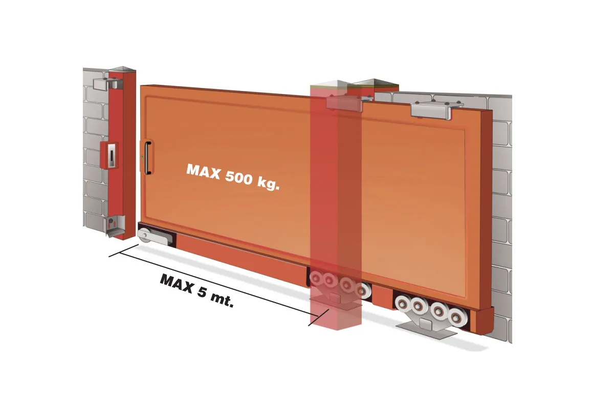 The cantilever gate system is a complete kit able to carry a sliding gate without having wheels or track in the ground in the opening passage. It consists of 2 trolleys, 1 guide, 1 final wheel, 1 stopper and on request other accessories from our catalogue (for example, upper guide, rail caps, base plate, etc. etc.) to install a sliding gate.
