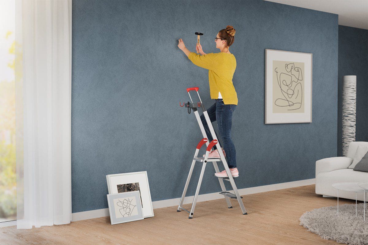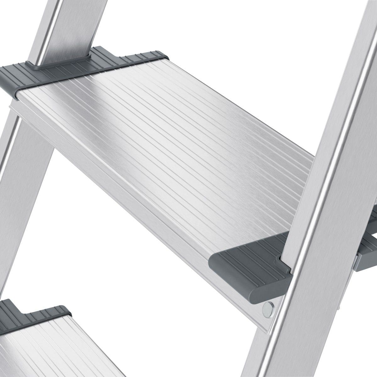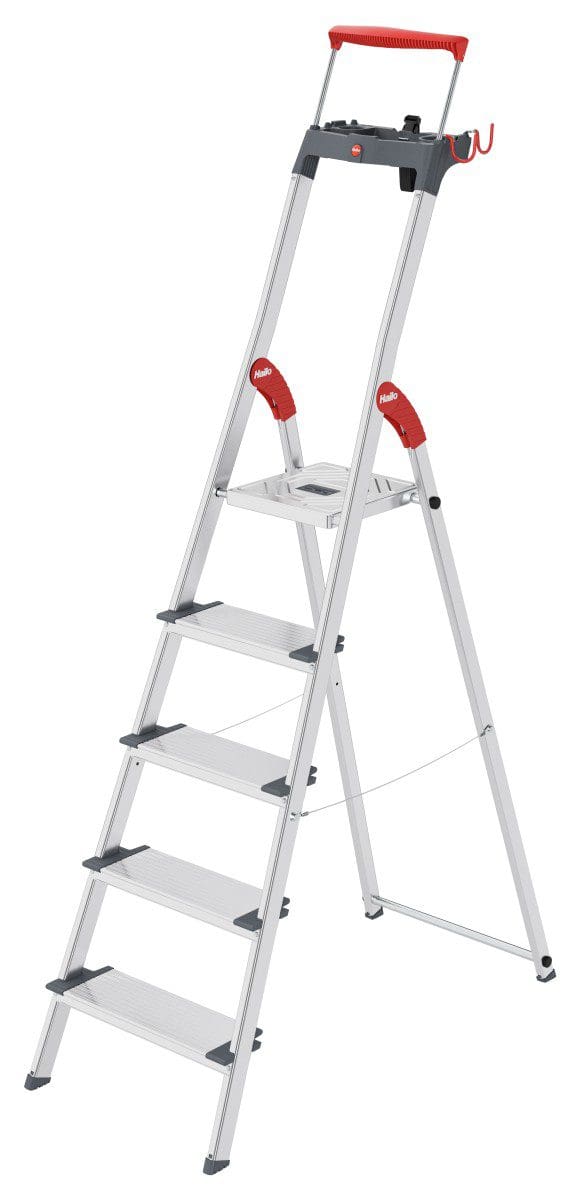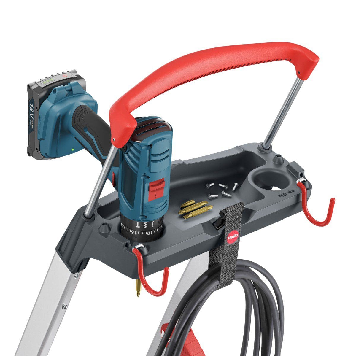 The aluminium safety ladder with multifunction tray, extendable safety rail and XXL steps.
