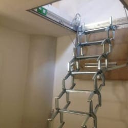 This retractable ladder is produced in Reggiolo Italy by Inlux SRL. It has comfortable 80 mm steps. An easy, comfortable, and practical way to access an area which is about three meters above ground level. When not in use it will be placed away, out of sight, in the ceiling, behind a chipboard panel which also has a steel lock. This rather low cost set of steps is made of galvanized steel. The top frame has a width of 800 mm and a length of 800 mm. The extended height of the retractable ladder is 3000 mm. It can also be shortened, if required.