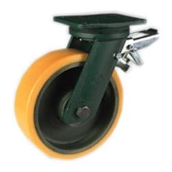 | Wheel description TR polyurethane tread; hardness 95 Shore A. Cast iron centre. Ball bearing bore The housing is obtained by moulding and turning and contains ball bearings series Z. Axle Axle composed of ground steel bush with bolt according to UNI EN 24017 and nut according to UNI EN 24032. Swivel top plate bracket EE HD, rear brake Swivel top plate bracket type EE HD, with a plate made of forged steel with integrated pin, a fork with two drawn sides electrowelded to the flange, swivel actions made of an axial ball bearing an a taper roller bearing, lubricator and nut anti-loosening system. Rear adjustable brake: adjustment of the brake setting alters product braking efficiency. |