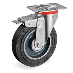 Swivel top plate bracket type NL. The plate, the ball rice ring and the fork are of pressed steel zinc plated finish; swivel actions: double ball greased race with dust protection seal made of polyethilene. The king pin is integral with top plate and duly rivetted. The front brake is necessary to lock wheel and top plate rotation.