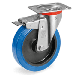 Non-marking blu elastic rubber wheels; hardness 70 Shore A. Polyamide 6 centre.